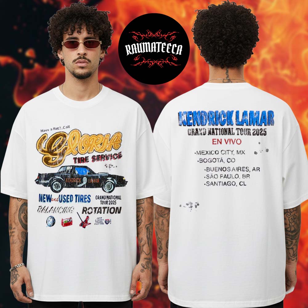 Embrace the bold visual identity of Kendrick Lamar’s touring era with the Grand National Tour Gloria Tire Service LATAM Two Sided Unisex T-Shirt—a standout piece that blends streetwear edge with tour-exclusive design flair. Crafted from premium, breathable cotton, this shirt delivers all-day comfort while showcasing high-quality graphics inspired by the LATAM leg of Kendrick’s Grand National Tour. The front design features the distinctive Gloria Tire Service motif, a playful nod to Kendrick’s creative world-building, while the back artwork expands the narrative with vibrant tour elements that capture the energy and symbolism of his stage presence.