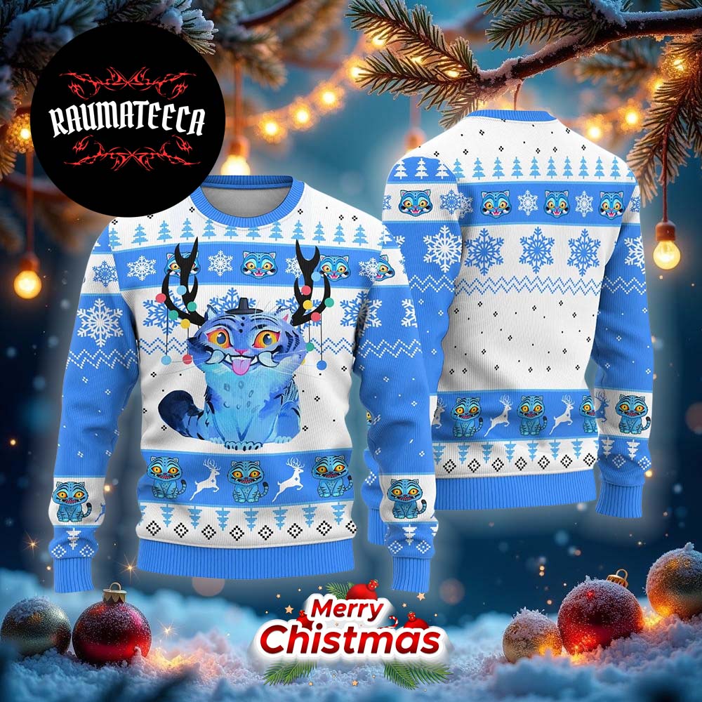Your search for the perfect Christmas sweater concludes with the Kpop Demon Hunters Blue Derpy Tiger Ugly Christmas Sweater from Raumateeca. This outstanding Christmas sweater is your ultimate companion for festive gatherings and events—an absolute attention-grabber that will brighten up your Christmas holiday!